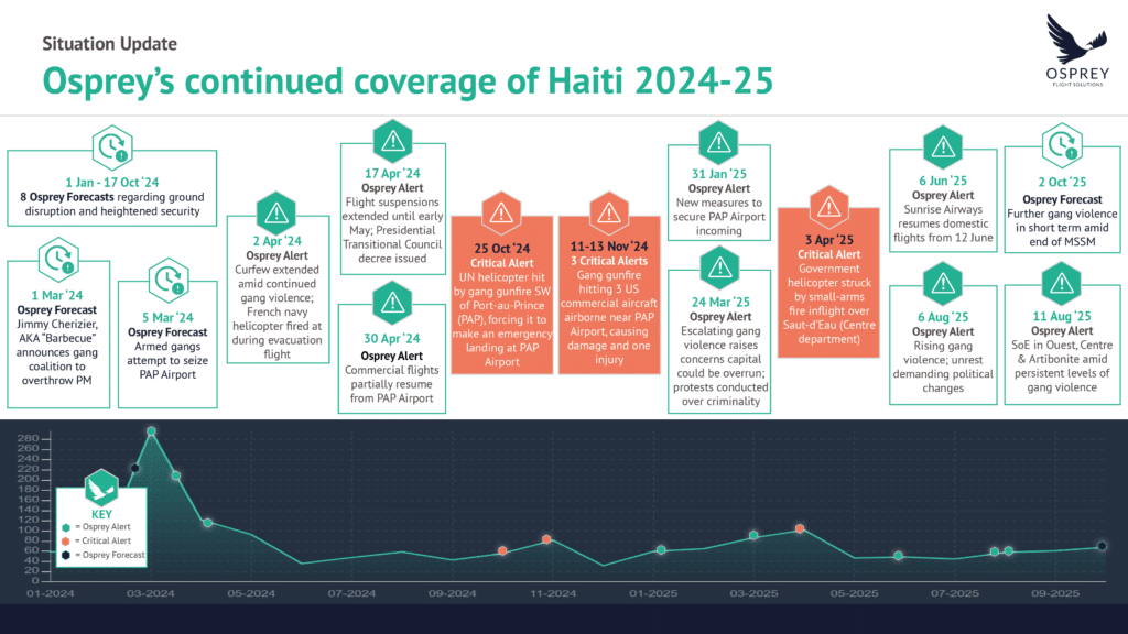 From 1 January 2024 until 21 October 2025, Osprey issued 80 notifications, including 14 critical alerts, 14 forecasts and 12 regulatory updates highlighting the targeting of helicopters with gunfire, airport disruption and flights gradual resumptions, security measures to reinforce the airport's perimeter, rising gang violence, anti-government unrest and political changes.